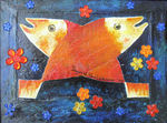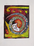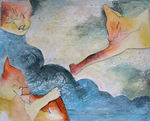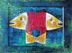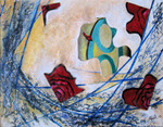 2013Uit oud werk op resten laminaat geplakt.Grote vogel, kan een roofvogel zijn die het kleinere fijnere, vliegende vissen kan verslinden.Materiewerk, gemengd, kleurijk, vol gevoel, intuitief.