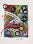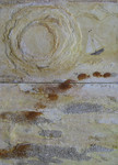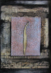 2013Uit oud werk met stempelen, rafelen, uiteenrafelen en intuitief samenstellen.Eenvoudig in opzet en uitwerking, kleur en vorm en niet vorm.Sporen, groeven en niet plat.Materiewerk.Op resten laminaat geplakt.