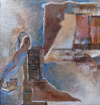 2013Uit oud werk samengesteld op laminaat.Samenstelling is geheel intuitief.Gelaagd, kleur en kleurverlies, zacht en licht en de resten van hard en fel.Het werk is alles behalve plat.